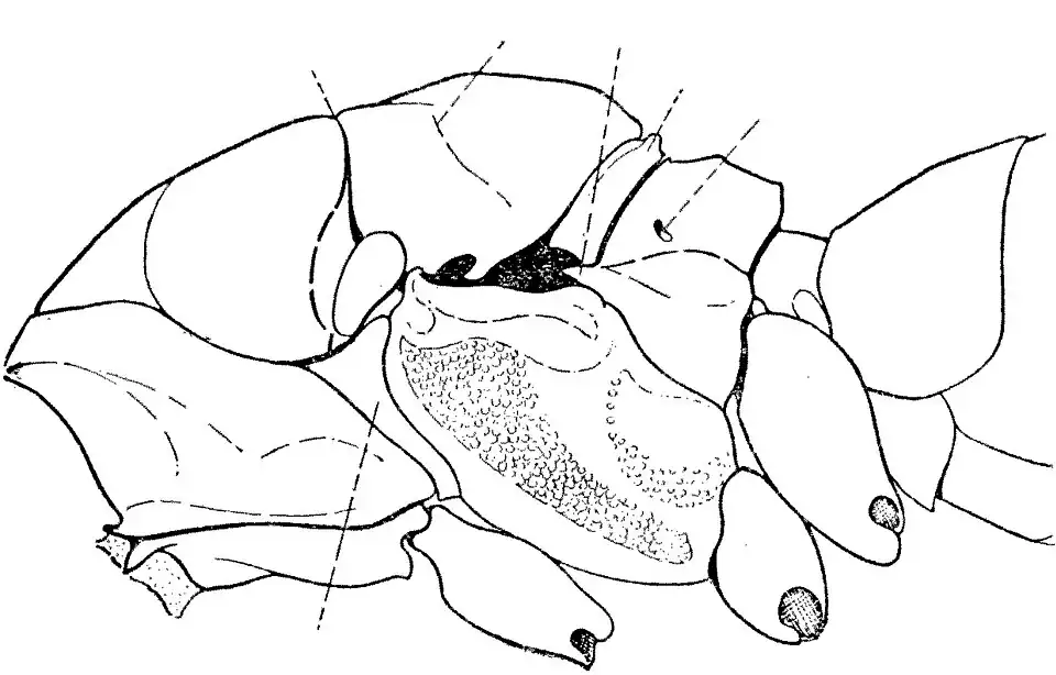 The face is the surface of the head between the inner margins of the eyes, below the anterior ocellus, and above the clypeus; the clypeus is the median (middle) region above the mouthparts, sometimes bounded by a suture between two anterior tentorial pits, and vertical sutures between each pit and the mouth. At the base of each antenna is an opening in the head capsule, around this opening is a ring-like structure called the torulus. The ventral (lower) margins of the toruli marks the lowest extent of the frons or upper face. The supraclypeal area is the median part of the face between the frons and the clypeus. The depression above each torulus is termed the scrobe; the scrobes usually converge into a scrobal depression. The interantennal area between the scrobes may form a ridge or lobe called the interantennal prominence or crest. The area between the scrobe and the eye is called the parascrobal area; a preorbital carina may form lines or grooves parallel to the inner margin of the eye.[4]