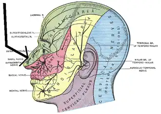 ![]() Sensory innervation to the head and neck. The external nasal nerve can be seen emerging from beneath the nasal bone (see tip of black arrow). | |
