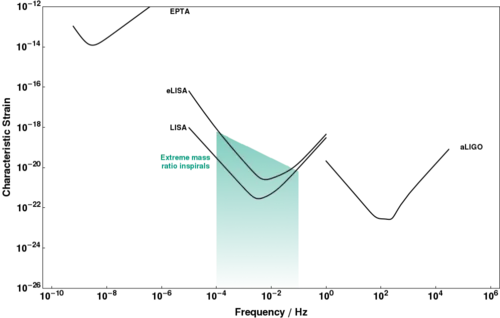 The main reason for scientific interest in EMRIs is that they are one of the most promising sources for gravitational wave astronomy using future space-based detectors such as the Laser Interferometer Space Antenna (LISA).[4] If such signals are successfully detected, they will allow accurate measurements of the mass and angular momentum of the central object, which in turn gives crucial input for models for the formation and evolution of supermassive black holes.[5] Moreover, the gravitational wave signal provides a detailed map of the spacetime geometry surrounding the central object, allowing unprecedented tests of the predictions of general relativity in the strong gravity regime.[6]
