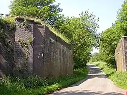 Northwest of the village, west of Woodford Road and Manitoba Way, are 20 acres (8 ha) of shallow hollows and mounds.[11] They are the remains of small pits and spoil heaps created by the quarrying of Northampton Sand, an iron-rich sandstone, probably in the Middle Ages.[11]