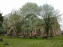 The oldest part of the Church of England parish church of Saint Nicholas is the Norman baptismal font.[5][7] A north aisle of two bays was added to the nave early in the 13th century.[5] The west tower was added early in the 14th century.[5] The north windows and (now blocked) doorway of the north aisle and the south windows of the chancel are 14th century Decorated Gothic.[7] The west window of the north aisle is late medieval, being late Perpendicular Gothic.[7]