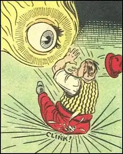 The Eye is a fictional comic book character created by Frank Thomas and published by Centaur Publications. The character had no origin story, and existed only as a giant, floating, disembodied eye, wreathed in a halo of golden light.[1] This powerful being was obsessed with the concept of justice, and existed to encourage average people to do what they could to attain it for themselves. If the obstacles proved too great, the Eye would assist its mortal charges by working miracles. Time and space meant nothing to the Eye and it existed as a physical embodiment of man's inner conscience.