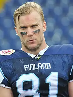 The National Football League's rulebook stipulates players are barred from "wearing, displaying or otherwise conveying personal messages either in writing or illustration, unless such message has been approved in advance by the League office."[6] In 2014 and 2015, Devon Still, Cameron Heyward, and DeAngelo Williams wore eye black with phrases supporting cancer awareness or loved ones battling cancer; Heyward and Williams were fined by the league for doing so despite their instances coming during the NFL's Breast Cancer Awareness Month campaign.[7][8] George Pickens received a fine in 2024 for eye black that included profanity.[9]