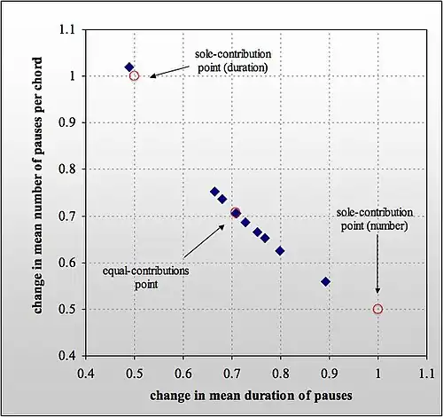 Souter hypothesised that the most likely scenario is that both pause duration and number are used to adapt to tempo, and that a number–duration relationship that lies close to the equal-contribution point allows the apparatus the greatest flexibility to adapt to further changes in reading conditions. He reasoned that it may be dysfunctional to use only one of two available adaptive resources, since that would make it more difficult to subsequently use that direction for further adaptation. This hypothesis—that when tempo is increased, the mean number–duration relationship will be in the vicinity of the equal-contribution point—was confirmed by the data in terms of the mean result: when tempo doubled, both the mean number of pauses per chord and the mean pause duration overall fell such that the mean number–duration relationship was (0.705,0.709), close to the equal-contribution point of (0.708, 0.708), with standard deviations of (0.138,0.118). Thus, the stability of scanpath—tenable only when the relationship is (0.5,1.0)—was sacrificed to maintain a relatively stable mean pause duration.[29]