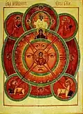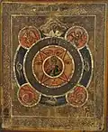 At the heart of the composition of such icons is the recurring motif of circles. In the central circle, Jesus Christ is depicted in the iconographic image of the Saviour Emmanuel with a blessing gesture. From this circle on the diagonal proceed 4 rays, on their tops are 4 small circles, inside of which are the allegorical symbols of the evangelists (see tetramorph), or less often, the images of the four evangelists themselves.