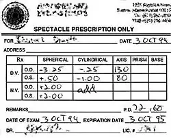 An eyeglass prescription is an order written by an eyewear prescriber, such as an optometrist, that specifies the value of all parameters the prescriber has deemed necessary to construct and/or dispense corrective lenses appropriate for a patient. If an eye examination indicates that corrective lenses are appropriate, the prescriber generally provides the patient with an eyewear prescription at the conclusion of the exam.