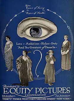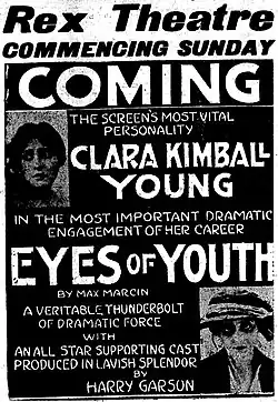 Eyes of Youth is a 1919 American silent drama film directed by Albert Parker and starring Clara Kimball Young. The film was based on the stage play Eyes of Youth, performed on Broadway in 1917-18 and starred Marjorie Rambeau. This film also features Rudolph Valentino in a role as a thief/con artist.[1][2]