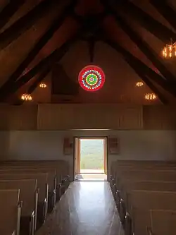 King Eystein Magnusson is said to have built mountain lodges along the road through the Dovrefjell mountains. Legend has it that there was also a church built in the area of today's village of Hjerkinn. Archaeological records support the idea that the church was likely built during the 11th or 12th century and it likely fell out of use sometime around the year 1500. All of this was the inspiration for the 20th-century Eysteinkyrkja. During the 1930s, discussions began for building a chapel along the old road through the Dovrefjell mountains near the Hjerkinn mountain lodge. The local priest in Dovre and the Bishop Kristian Schjelderup supported the idea. Magnus Poulsson was hired to design the new church (although he died before its completion and his son Anton Poulsson finished the work). The new modern-looking concrete church was completed in 1969. The building was consecrated on 3 August 1969. The nave is almost trapezoidal in shape, although it is a long church, with the exterior walls angled towards each other as they get closer to the chancel.[3]
