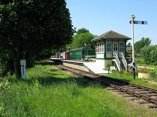 Eythorne railway station is a station on the East Kent Railway. Originally a station on the East Kent Light Railway, It opened on 16 October 1916 but closed to passenger traffic after the last train on 30 October 1948. It served as the junction for the branch to Guilford Colliery, which was abandoned in 1921. The track on this branch was lifted in 1931 but relaid during World War II to accommodate a 9.2 inches (230 mm) rail mounted gun. The station served the village of Eythorne, it reopened as part of the East Kent Railway in 1993.[2]