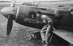 After the establishment of the State of Israel, Weizman was a pilot for the Haganah in the 1948 Arab–Israeli War. He was the commander of the Negev Air Squadron near Nir-Am. In May 1948, he learned to fly the Avia S-199 (Messerschmitt Bf 109) at the České Budějovice air base in Czechoslovakia (Operation Balak) and participated in Israel's first fighter mission (executed by its "first fighter squadron"), a ground attack on an Egyptian column advancing toward Ad Halom near the Arab town of Isdud south of Tel Aviv.[5] In a battle between Israeli and British RAF aircraft on 7 January 1949, he flew one of four Israeli Spitfire fighters that attacked 19 British fighters, which were on a rescue mission in Egypt searching for four aircraft that had been destroyed in an earlier IAF attack.[6] An RAF Hawker Tempest was shot down by the IAF, resulting in the death of the pilot.[6] Due to a failure by ground crewmen, most of the RAF aircraft were not armed.[7]
