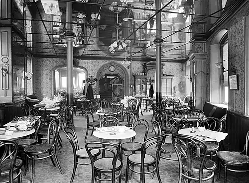 First floor of the Vienna Café with its mirrored ceiling, Oxford Street, in 1897. The room became a meeting place for Pound, Wyndham Lewis, and other writers.