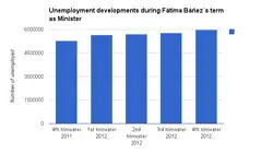 On 24 January 2013, thirteen months into her post of Minister of Employment and Social Security, the number of unemployed in Spain stood at 5,965,400 and the unemployment rate was 26.02%.[12] On 25 April 2013, according to the EPA (Spanish Labour Force Survey), the number of unemployed workers in Spain was 6,202,700 and the unemployment rate was 27.16% of the employable population.[13] Her reforms are widely credited with helping reduce unemployment, which stood at 18.9% in later 2016, still the second highest rate in the European Union after Greece.[14]