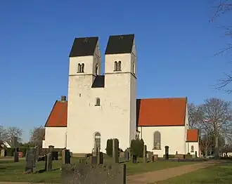 The presently visible church was preceded by a wooden stave church, built during the 11th century. The oldest parts of the presently visible Romanesque church date from about 1180. The twin tower, the nave and the choir form the oldest parts of the church. According to legend, the two towers were constructed by the wife of a local knight. The story goes that the knight went away to fight in a war while his wife was pregnant, and asked his servants to build a tower to the church in case she gave birth to a son. When he returned from the war and saw the two towers, he realised that she had given birth to twins.[1] In reality, twin western towers are not an unknown element in Romanesque architecture, although not known from any other parish church in Scania.[2] While it is unknown who built the church and why, the presence of the twin towers thus do denote high ambitions.[3] From the extensive use of finely cut and worked granite, scholars have deduced that the workers building the church probably came from Jutland, where similar granite churches exist.[3] During the 15th century, the vaults in the choir were decorated with murals. During the late Middle Ages the nave was also vaulted;[3] but when the church was enlarged towards the north in 1770, these vaults were destroyed. The southern transept was added roughly a hundred years later.[1]