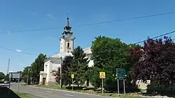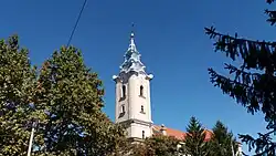The bell tower was built in 1713. In 1770 when the bell tower was being raised, two bells were removed from the old tower and then placed in the new tower. One of the bells was made in 1744 and the other was made in 1758 and each had a weight of 3 Vienna centner (168 kilograms). These bells were replaced in 1868 with 3 new bells. The new bells were made by Ignácz Hilzer in Bécsújhely and were put up into the tower by József Pozdeck Budapest.[28] The big bell 16 Vc (907 kg) and the middle bell 9 Vc (528 kg) were taken to war in 1917. Instead them, the Church had two new bells made in 1923. The new big bell was 855 kg and the new middle bell was 517 kg and have remained until today. The 283 kg small bell made in 1868, it had been cracked and was replaced in 1998 by a 260 kg bell had been made by Lajos Gombos in Őrbottyán.