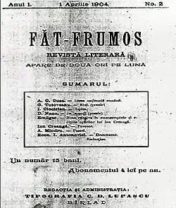 Făt Frumos was a semimonthly literary magazine published in Bârlad, Romania. Covering political, economic and literary topics, was first printed on 15 March 1904 at the C. D. Lupaşcu printing shop. The chief editors were George Tutoveanu and D. Nanu, and, at a later date Corneliu Moldovanu and Anastasie Mândru. The last issue of the magazine was printed on 1 February 1906. From 1 March 1909 to 1 April 1909 it was edited by writer Emil Gârleanu.