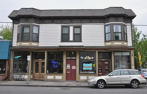 The building is a wood-frame structure erected in the late 19th century to house businesses serving the Sunnyside neighborhood. Exterior features of the 50-by-60-foot (15 by 18 m) building include a cornice and overhanging 3-foot (0.9 m) parapet along the front (north) face. The second-floor north face has a central pair of double-hung sash windows flanked by two polygonal bays, each with three sash windows. Three doors and four display windows on the first floor face Belmont Street. The door in the center leads to a stairway to the second floor.[4]
