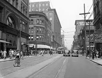 F.W. Woolworth, an American retailer, occupied the building from 1913 to 1976.[5] After Woolworth took over the building, it covered the Philip Jamieson Clothing Company name which was etched in the brick façade.[7] In the late 1960s, Woolworth's would dramatically alter the building by adding white cladding to the entire building hiding the original architecture.[8]