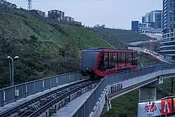 The F3, also known as the Vadistanbul Monorail (Turkish: Vadistanbul Havaray, meaning Vadistanbul Air-rail) and officially referred to as the F3 Vadistanbul-Seyrantepe funicular line (Turkish: F3 Vadistanbul-Seyrantepe füniküler hattı), is a 750 m (2,460 ft) long funicular railway in Sarıyer, Istanbul.[2] The line is one of four funicular railways in Turkey, all of them in Istanbul, and is the only one that operates above ground. Because the F3 runs along a concrete viaduct, it has been advertised as a Monorail even though it is technically a funicular railway. The route runs between Vadistanbul and Seyrantepe, where connection to the M2 line is available.