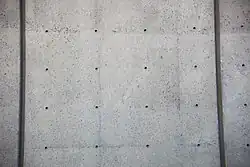 The J. Edgar Hoover Building is in an architectural style known as Brutalism.[57][58] The term is derived from the French term béton brut ("raw concrete"); in Brutalist structures, unprocessed concrete surfaces are commonly used to create "rugged, dramatic surfaces and monumental sculptural forms."[59] The concrete of the Hoover Building shows the marks from the rough wood forms into which the liquid concrete was poured. The exterior is constructed of buff-colored precast and cast-in-place concrete.[29][60] The intent was to attach sheets of polished concrete or granite to the exterior. The exterior walls were built to accommodate these attachments, but this plan was abandoned as the building neared completion.[55] The windows were of bronze-tinted glass.[45] The cornice line is 160 feet (49 m) high on the E Street side.[61] The interior, as built, consisted of white vinyl floor tiles, and polished concrete ceilings and floors painted white.[60] The open-air courtyard was paved with grayish-beige stone, and contained an arcade to shelter employees as they moved around its edge.[60]