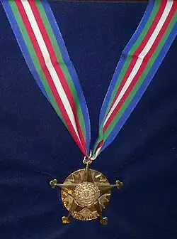The United States' Federal Bureau of Investigation instituted an Honorary Medals Program in 1989 as a way of recognizing "exceptional acts" by FBI employees and other law enforcement personnel working with the FBI.[1] These medals were created to supplement the then-existing reward system within the Bureau.[2] There are four medals in the program intended for personnel: the FBI Star, the FBI Medal for Meritorious Achievement, the FBI Shield of Bravery, and the FBI Medal of Valor. One additional medal, the FBI Memorial Star, is for a surviving relative when a death has occurred in the line of duty.[1] These medals are considered to be among the highest honors granted by the FBI, and fewer than 400 had been awarded as of March 2009.[1]