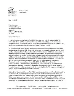 On May 12, the DOJ issued a grand jury subpoena to the National Archives for the classified documents they had provided to the House select committee investigating the January 6 United States Capitol attack.[90]