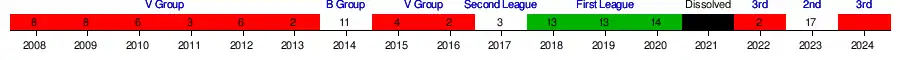 | 2012–13 | V Group | 2 | 22 | 5 | 3 | 52 | 10 | 71 | not qualified | ||