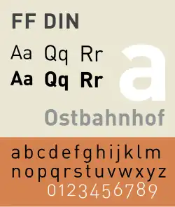 FF DIN is a sans-serif typeface in the industrial or "grotesque" style. It was designed in 1995 by Albert-Jan Pool, based on DIN-Mittelschrift and DIN-Engschrift, as defined in the German standard DIN 1451. DIN is an acronym for Deutsches Institut für Normung (German Institute of Standardisation).[2] It was published by FontShop in its FontFont library of typefaces.[3][4]