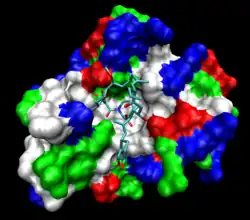 ![]() The human protein FKBP12 bound to FK506 (tacrolimus). The protein surface is colored by hydrophobicity; the deep cleft in which the ligand is bound is hydrophobic. | |||||||||