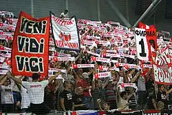 The members of Firma call themselves Firmaši (lit. 'Members of the Firma'), the plural of the singular form Firmaš, and belong today to the top supporter groups in Serbia.[25] They are more known as ultras, not hooligans. However, they always protected the name and honour of FK Vojvodina, Novi Sad, and Serbia – putting themselves against all who were not doing enough for the club.[26] The Firmaši gather in the north stand of the Karađorđe Stadium, from where they fiercely support their club. Besides football, they also support other sport sections of the Vojvodina Novi Sad Sport Association. The club also has a group of their oldest supporters, called the Stara Garda (lit. 'Old Guard') and who are for more than 40 years in the east stand of the stadium.[27]