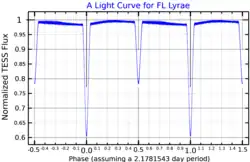 FL Lyrae is the variable star designation for an eclipsing binary star system in the northern constellation of Lyra. The combined apparent magnitude of the pair is 9.36,[3] which means they are too faint to be seen with the naked eye. Parallax measurements put the system at a distance of around 437 light years from the Sun. This star system was in the view field of the Kepler space telescope during 2009−2014,[5] which allowed monitoring during that spacecraft's mission.[8]