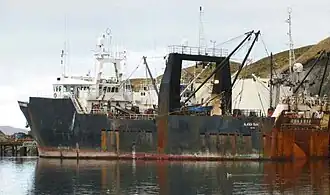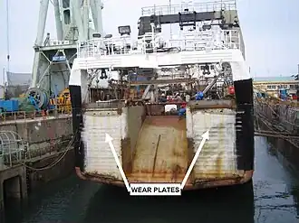 ![]() Wear plates fitted over stern of Alaska Ranger, shown in 2005. Stern ramp in the center allowed nets to be launched into the sea and then hauled on board with their catch.