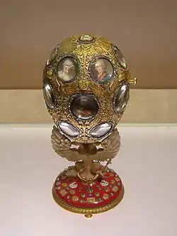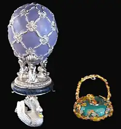 A Fabergé egg (Russian: яйцо Фаберже, romanized: yaytso Faberzhe) is a jewelled egg first created by the jewellery firm House of Fabergé, in Saint Petersburg, Russia. As many as 69 Czarist Russia Era eggs were created, of which 61 are currently known to have survived.[1] Virtually all of the original first edition eggs were manufactured under the supervision of Peter Carl Fabergé between 1885 and 1917.[2][3] The most famous of the firm's creations are the 50 delivered Imperial Easter eggs,[4][5] of which 44 are currently known to be in complete or partial physical existence, leaving the fate of those remaining unknown.