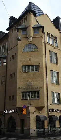 It was one of the first blocks of flats in the area. Its national romantic-Art Nouveau style pioneered indigenous Finnish residential architecture and influenced later buildings by Grahn, Hedman & Wasastjerna and Toril and Nyberg.[1][2][3][4][5] It rises five storeys, clad in rough yellow plaster.[6] There is no cornice, but the main façade, facing the square, is interrupted asymmetrically by oriel windows of various shapes and a long balcony.[4][7] The main façade and the corner, which is formed by geometric shapes, are ornamented with grotesques moulded in smooth plaster.[2] The façade facing Pohjoinen Makasiinikatu is rhythmically pierced by bay windows.[8] The roof is steeply pitched and again asymmetrical, with gables of varying heights;[4] the architects' original reddish tiles[7] have been replaced with copper.[2]