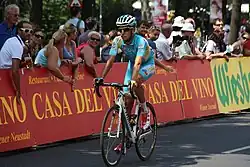 In 2015, Aru came in sixth at the Volta a Catalunya. In April, he missed the Giro del Trentino because of an intestinal ailment.[14] Greg Henderson accused Aru of faking the ailment, and actually skipping due to a pending biological passport case.[15] Aru promised to sue Henderson for his accusations as he was preparing for the Giro d'Italia.[16] In May 2015, it was announced that Aru's contract with Astana was renewed until the end of 2017.[17] The Giro d'Italia started off poorly for Aru's Astana team, losing seconds to Alberto Contador and the Tinkoff–Saxo team. However, in the first week of racing, Aru attacked Contador in the mountains as he was led by his Astana team, remaining only seconds behind Contador in the general classification battle.[18][19] When Contador crashed on stage 13 in a pile-up, Aru crossed the line well in front of Contador, securing the first pink jersey of his career.[20] However the next day, a 59.3-kilometre (36.8-mile) individual time trial, hyped as the Giro's determining day, Aru lost 2 and a half minutes to Contador, thus losing the pink jersey.[21] He lost more time in the Mortirolo stage, but bounced back on Stage 19 to take an emotional solo victory.[22] On Stage 20 featuring the Colle delle Finestre, Aru won his second consecutive stage, taking two minutes from Contador but failing to take the pink jersey.[23]