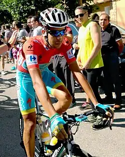 Fabio Aru (born 3 July 1990) is an Italian former professional road bicycle racer, who rode professionally between 2012 and 2021 for the Astana, UAE Team Emirates and Team Qhubeka NextHash squads.[6] He hails from San Gavino Monreale in Sardinia, and is known for his climbing ability, which made him a favorite for the Grand Tours. He is known as "The Knight of the four Moors", a reference to his native island of Sardinia.