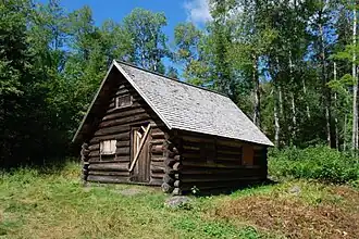 The Fabyan Guard Station is located about 0.7 miles (1.1 km) north of United States Route 302, on Cherry Mountain Road near a crossing of Desolation Brook. It stands in a small clearing on the west side of the road. It is a single-story log structure, measuring about 16 by 20 feet (4.9 m × 6.1 m), with a gabled roof. It is built out of spruce logs, with the gaps filled with wooden slats and chinked with oakum. The main facade has a door on the right, fashioned out of vertical boards, and windows to its left and in the gable above. The side walls each have two small windows.[2]