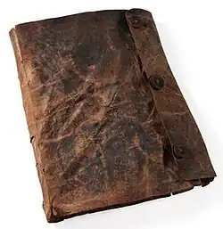 The original leather binding has a fold-over flap with three horn buttons that were probably used to secure a thong or straps, now missing, that tied the cover up; it does not seem to have been physically attached to the gathered and sewn-together pages inside, forming what we might call today a folder or wallet. Similar covers seem to be shown in some images in manuscripts, but no comparable covers have survived. The outside of the cover was "painted with black carbon-based pigment".[7] The leather seems to have been used as a trial piece or sketchpad for composing patterns of interlace for other objects. On the inside there is a sheet of papyrus, presumably used as a liner to stiffen the cover somewhat.[8]