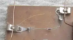 A Fahnestock clip is an early type of spring clamp electrical terminal for connections to bare wires. It is still used in educational electronic kits and teaching laboratories in schools. It is designed to grip a bare wire securely, yet release it with the push of a tab. The clip was patented in the United States on February 26, 1907[1] by John Schade Jr., assigned to Fahnestock Electric Co. Less than two weeks after the patent was issued they filed for reissue.[2][3]