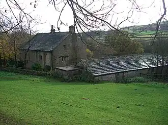 The outbuildings are detached from the main house and run at right angles to it on its western side. They are approximately 12 metres in length and slope down to the valley of the Dale Dike, so much so that the downhill end of the building has two storeys while the uphill end has only one. The building materials are the same as the main house, being gritstone blocks and stone slate and the mainstay of the building is believed to be 17th century. However, there have been some changes to the original design with a large boarded double door being added and resulting changes to the stonework to make a garage. There have also been some modifications to some of the other openings.[4]