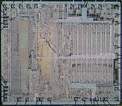 The 9445, no longer referred to as a MICROFLAME, was a major advance on the 9440. One significant change was the move from 3-micron to 2-micron feature sizes, which allowed more gates to be constructed on the chip without affecting yield, and allowing the operating speeds to be increased to 24 MHz, double that of the 9440.[12]
