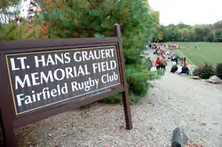 The home Rugby Pitch of the Red Ruggers is the Lt. Hans Grauert Memorial Field. Christopher Grauert, '68 and his mother, Leila B. Grauert, donated the rugby pitch to Fairfield in 2003 in honor of his brother Lt. Hans Grauert, who was a naval aviator lost at sea during the Vietnam War. During the dedication ceremony at the FURFC 40th Anniversary Celebration, Grauert read a letter written by his mother to honor the players and the esteemed tradition of hard efforts on and off the field of the Red Ruggers. In the letter, Grauert's mother wrote, "Like everyone else in this room, Hans possessed the traits which personify every rugger—athleticism, good sportsmanship, and a zest for life. This rugby pitch resides in the softest part of my heart and will always remain 'God's Little Acre' to me!"[7]