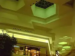 Each anchor court features a large sculpture and seating areas. The interior features terrazzo-tiled flooring, wood trimmed glass railings, and white walls and ceilings articulated with geometric, hexagon shaped skylights featuring three halogen lights mounted on the apex of each dome. Access among the three retail levels is provided by a complex network of stairs, ramps, escalators, and two lighted "octa-lift" elevators each located in the center of the mall.