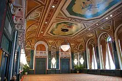 Along with traditional features found in most Chateauesque-styled hotels, the building also incorporated an Art Deco setback and Romanesque-inspired decor.[6] The balanced design of the building (before the addition of the east wing) was achieved through the application of semi-neoclassical motifs, and groups of arcaded windows.[9] The interior of the building was largely created in an Edwardian architectural style.[6] Its interior features a number of crystal chandeliers, and a hand-carved wood lobby ceiling.[10]