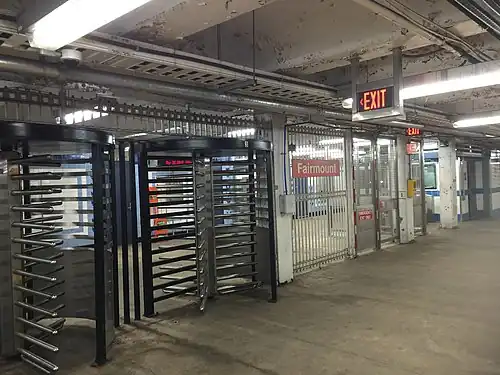 Fairmount station is a subway station in the Francisville section of North Philadelphia, Pennsylvania. It is served by SEPTA's B1 and the B3.[2] There are three separate platforms. The B3 and B1 northbound platforms connect inside the faregates, but the B1's southbound platform cannot be reached from the other two without exiting. Such a connection once existed; the sealed-off entrance can be seen at platform level heading south towards the end of the platform. Travelers wishing to switch between the B3 and the southbound B1 must connect at Broad-Girard. The B3's platform is shortened and can only accommodate short 2-car trains; the unused part of the platform is visible from passing trains and is covered in layers of graffiti. Fairmount station on the B3 has a full mezzanine concourse extending from Wallace Street to Ridge Avenue, now abandoned.