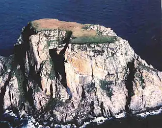The island supports a breeding colony of about 35,000 seabirds, including some 25,000 least auklets and crested auklets.[3] In 1925, the tufted puffin (Fratercula cirrhata), horned puffin (Fratercula corniculata), parakeet auklets (Aethia psittacula), and Pallas' murre (Uria lomvia arra) were reported at Fairway Rock, nesting in the crevices of the island's cliffs.[14] A 1960 account reports that Eskimo inhabitants of Little Diomede reported a glaucous gull (Larus hyperboreus) colony on Fairway Rock larger than that on Little Diomede.[15]