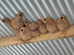 The nest is a retort- or bottle-shaped structure, made from up to a thousand mud pellets and lined with dried grasses and feathers. The bowl is about 15 centimetres (5.9 in) in diameter, and the entrance tunnel is 5–30 centimetres (2.0–11.8 in) long. The nests in a colony are clustered together. Both sexes build the nest and share incubation and care of the young.