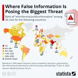 Fake news and similar false information (misinformation or disinformation[1]) is fostered and spread across India through word of mouth, traditional media and more recently through digital forms of communication such as edited videos, websites, blogs, memes, unverified advertisements and social media propagated rumours.[2][3] Fake news spread through social media in the country has become a serious problem, with the potential of it resulting in mob violence, as was the case where at least 20 people were killed in 2018 as a result of misinformation circulated on social media.[4][5]