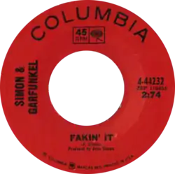 "Fakin' It" was issued as a single that summer and found only modest success on AM radio; the duo were much more focused on the rising FM format, which played album cuts and treated their music with respect.[10] The running time of the song was actually 3 minutes and 14 seconds. Radio stations at the time resisted playing songs lasting longer than three minutes, so Paul Simon had the time "faked" to read 2:74 on the label. Simon preferred the album version of "Fakin' It" to its single release. He felt the stereo remix "greatly improved" the original mix, which he considered to be "sloppy."[9] On the other hand, Billboard particularly praised the production of the single version.[11]