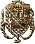 The cap badge is the badge of the FIDF cast in metal. It shows the escutcheon party per bend, with a Sea Lion in the lower half, and the rear end of an old sail ship in the upper half, surrounded by the slogan "Desire the Right". This badge was formerly the Coat of arms of the Falkland Islands from 1925 to 1948.[28]