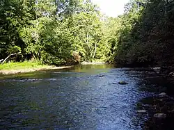 In Madison County, Fall Creek joins with Sly Fork in Adams Township. In Pendleton, the creek joins Prairie Creek and forms the basis of the Fall Creek Park of 150 acres (610,000 m2).[3] Here, on January 12, 1825, the first execution of a white man for crimes against Native Americans in the United States was held when James Hudson was hanged for his role in the Fall Creek Massacre of 1824. Fall Creek was named for the waterfall near Pendleton.[4] Three small waterfalls are found in succession at the park, and at points the creek becomes wide and shallow enough to nearly walk across. Fall Creek is then joined by Fosters Branch and Lick Creek.